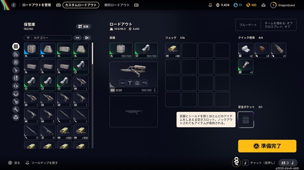手に入れたアイテムを持ち込んで出撃する“カスタムロードアウト”では安全ポケットを使用することができます。